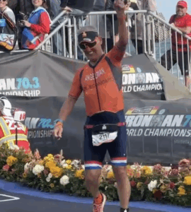 Hieronder de video, maar eerst dit: alvorens bij de finishlijn aan te komen is er uiteraard een werkelijk ‘sensationele’ prestatie geleverd qua zwemmen, wielrennen en hardlopen.